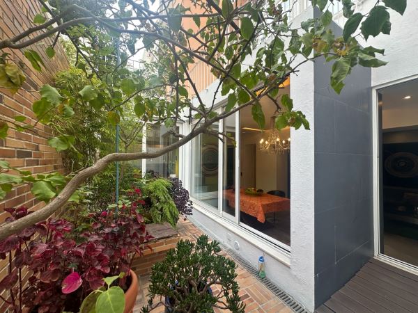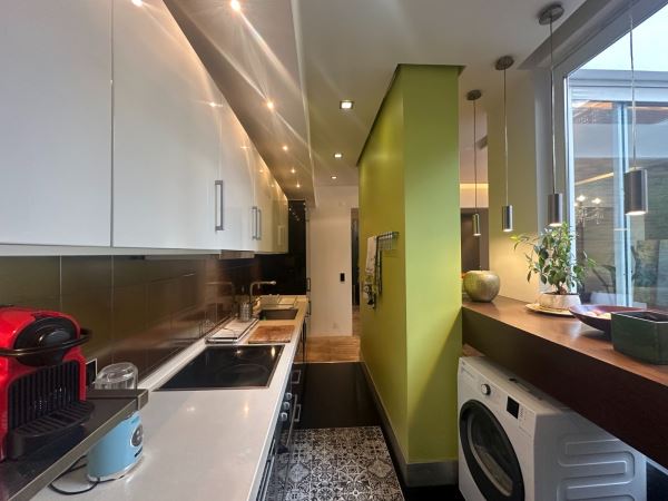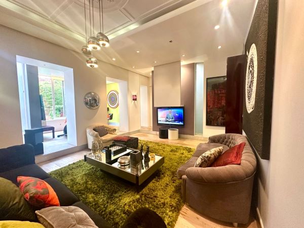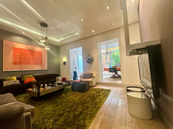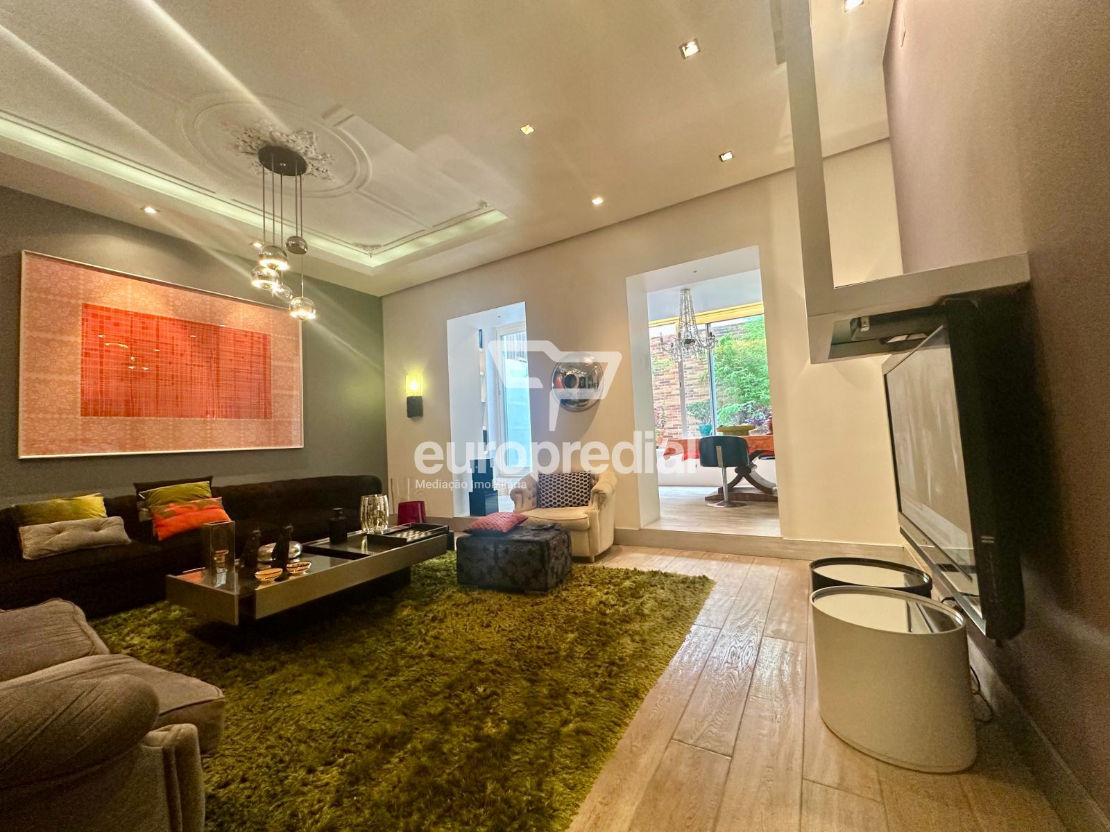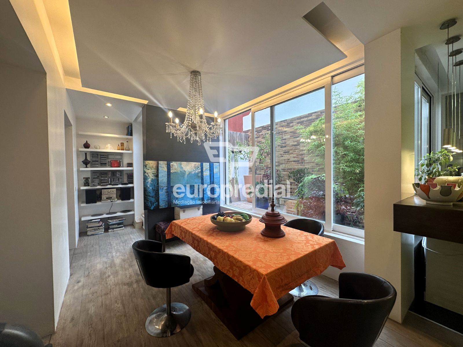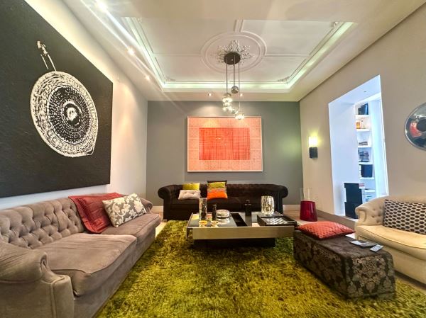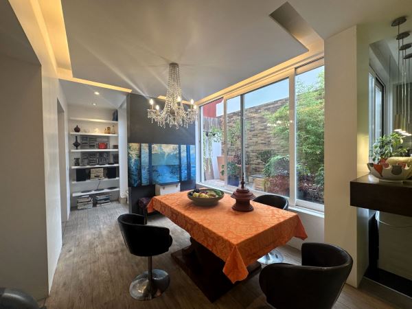 A decoração combina peças de arte cuidadosamente selecionadas com elementos de inspiração nipónica, criando um ambiente envolvente, luminoso e acolhedor. A fluidez entre a sala de estar, a sala de jantar e o pequeno jardim exterior confere uma sensação de continuidade e de vivência natural, ideal para momentos de descanso ou convívio.
